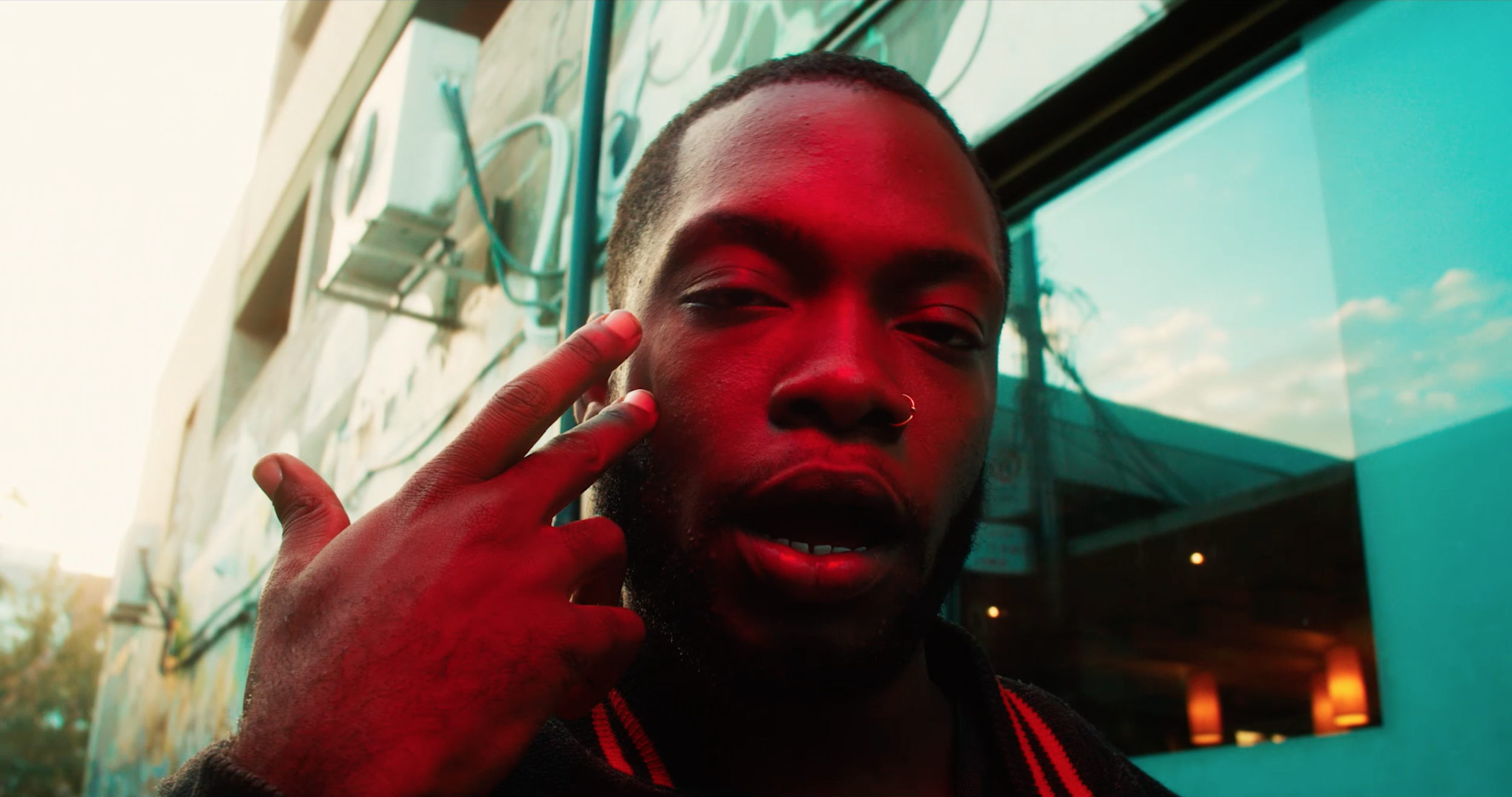 Person lying on the ground in a white tank top, with a red light cast over the scene, holding a broken smartphone.